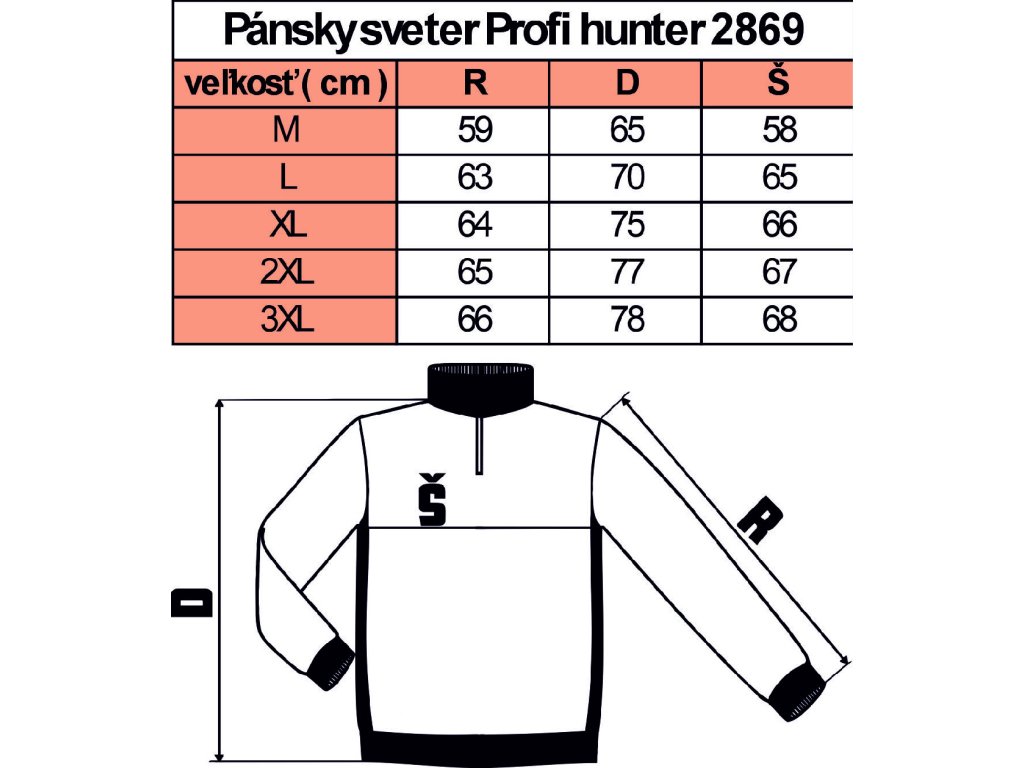 Sveter s vyšším golierom so zapínaním na zips. Na ramenách a lakťoch našitá zelená látka na spevnenie. Na ľavej strane malé vrecko na zips.   Materiál je veľmi príjemný k pokožke, nehryzie a nedráždi. Farba pulóvra zeleno čierny melír. Vhodný nielen pre všetky lesnícke a poľovnícke práce, ale aj pre voľný čas a spoločenské udalosti.