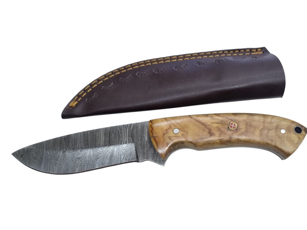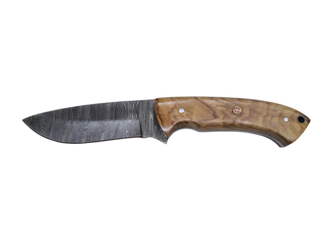 Poľovnícky nôž s 10cm damaskovou 176 x prekladanou čepeľou. Damasková oceľ, ktorá je známa svojou výnimočnou ostrosťou, odolnosťou a krásnym vzorom na povrchu. Rukoväť je drevená, na konci rukoväte je otvor na prevlečenie bezpečnostnej šnúrky. Celková dĺžka noža je 23cm. Súčasťou je aj kožené púzdro, ktoré sa dá pripevniť na opasok.