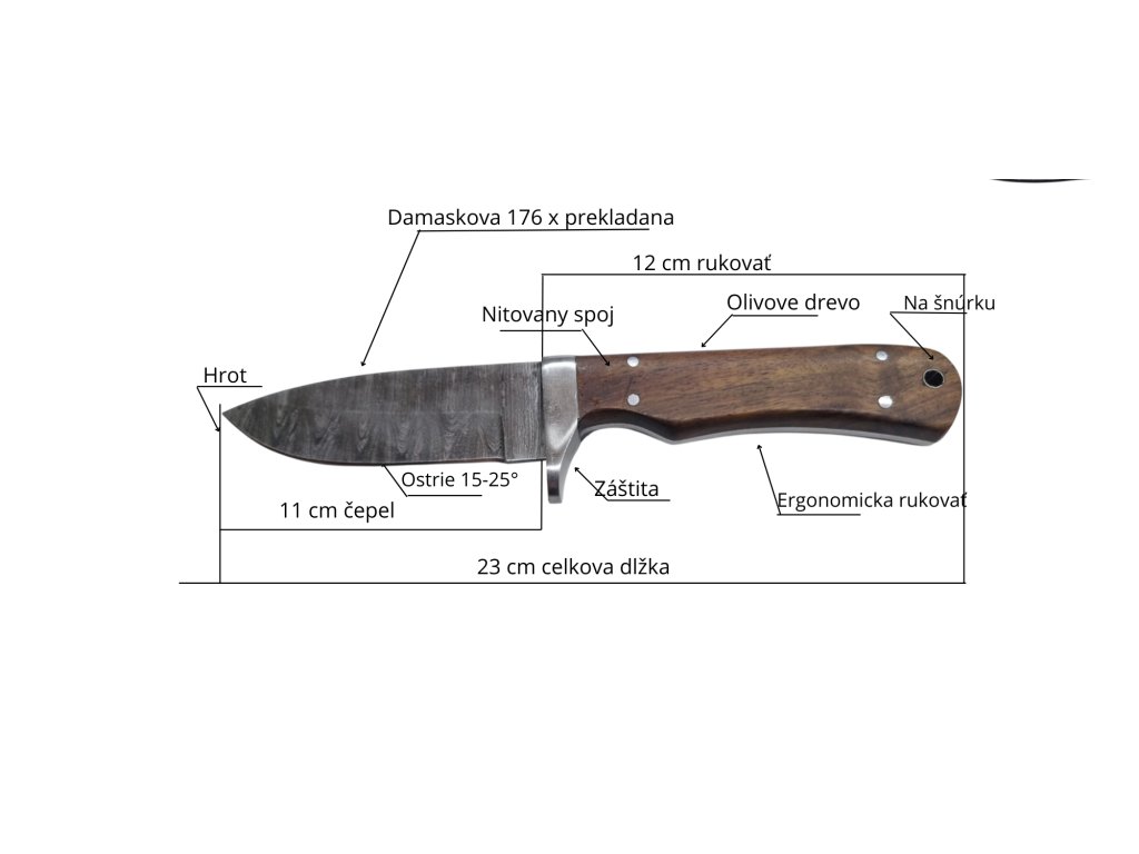 Poľovnícky nôž s 11cm damaskovou 176 x prekladanou čepeľou. Damašková oceľ, ktorá je známa svojou výnimočnou ostrosťou, odolnosťou a krásnym vzorom na povrchu. Rukoväť je drevená s kovovou záštitou. Na konci rukoväte je otvor na prevlečenie bezpečnostnej šnúrky. Celková dĺžka noža je 23cm.