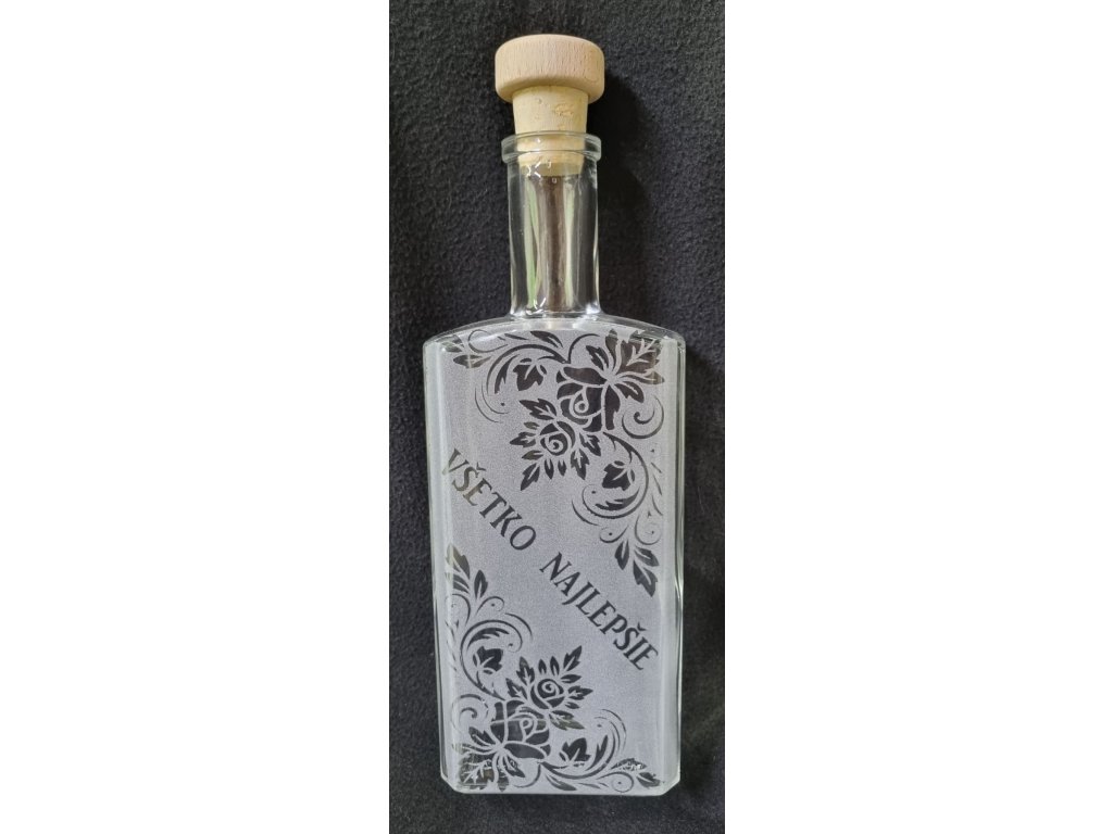 Sklenená fľaša s objemom 1000ml, zdobená vygravírovaným nápisom "VŠETKO NAJLEPŠIE", predstavuje štýlový a osobitný doplnok. Fľaša je vyrobená z vysoko odolného skla, ktoré je vhodné pre skladovanie nápojov. Tento materiál je bezpečný na použitie a chráni obsah fľaše pred vonkajšími vplyvmi.