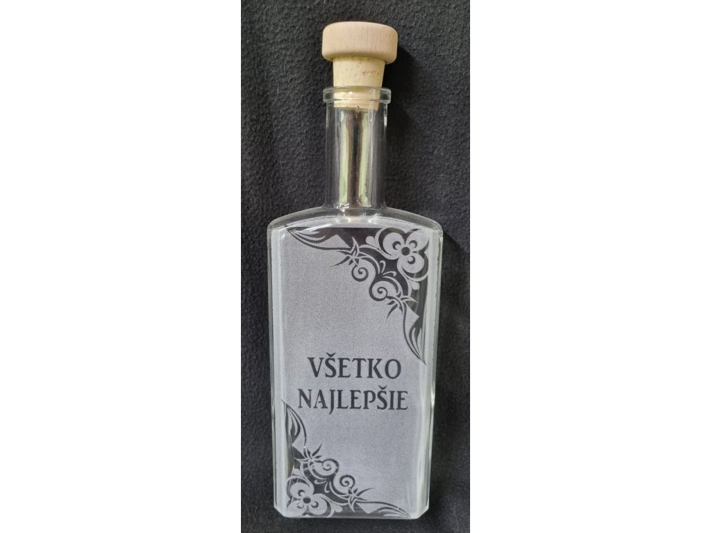 Sklenená fľaša s objemom 1000ml, zdobená vygravírovaným nápisom "VŠETKO NAJLEPŠIE", predstavuje štýlový a osobitný doplnok. Fľaša je vyrobená z vysoko odolného skla, ktoré je vhodné pre skladovanie nápojov. Tento materiál je bezpečný na použitie a chráni obsah fľaše pred vonkajšími vplyvmi.