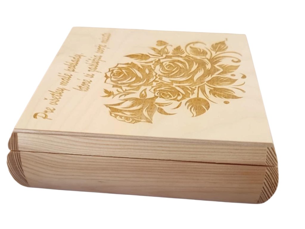 Na veko drevenej krabičky vieme vygravírovať vlastný nápis, venovanie, dátum, meno alebo dokonca jednoduchý obrázok či symbol. Či už ide o krátky citát, meno dieťaťa, iniciály novomanželov, srdce, krížik, labku, motýľa alebo ručne kreslený motív – radi premeníme vašu predstavu na originálny gravírovaný detail, ktorý urobí z krabičky skutočne jedinečný kúsok.