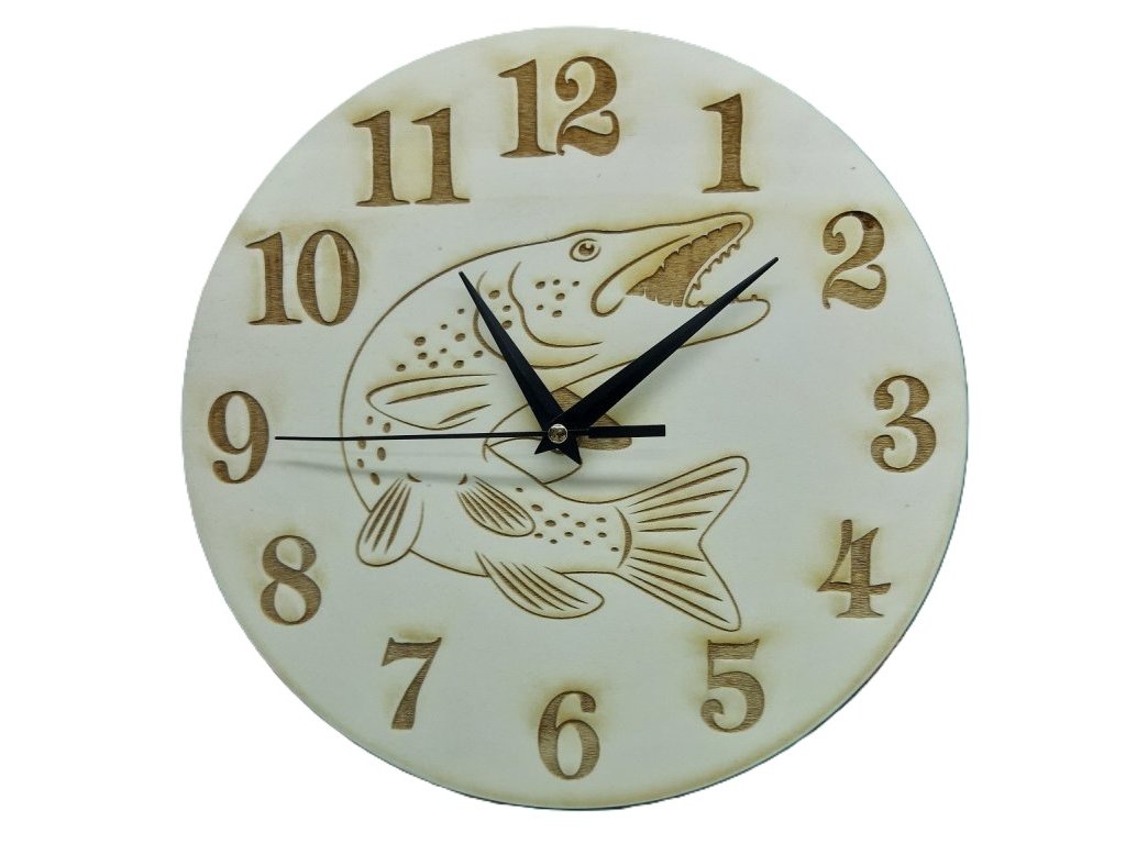 Drevené kruhové hodiny motív Šťuka s priemerom 25 cm vypálené motívy laserom predstavujú jedinečný a štýlový doplnok do vášho domova.