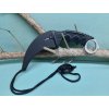 Bojový obranný nôž karambit so striebornou, zahnutou čepeľou. Má plastovú tvarovanú rukoväť zakončenú kovovým očkom a čierne plastové púzdro s prevlečeným lankom. Dĺžka noža 19/9cm.