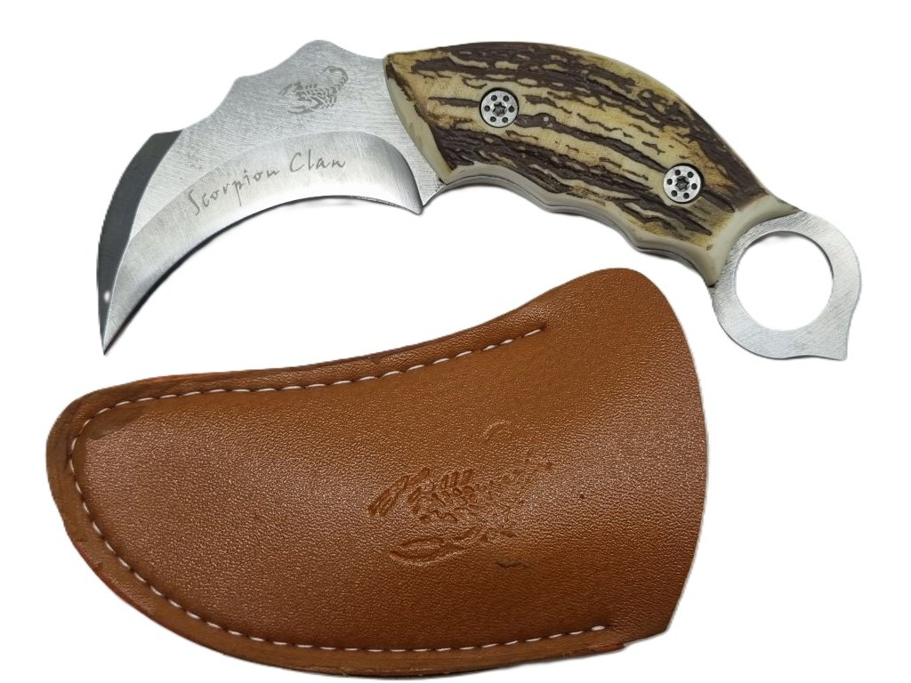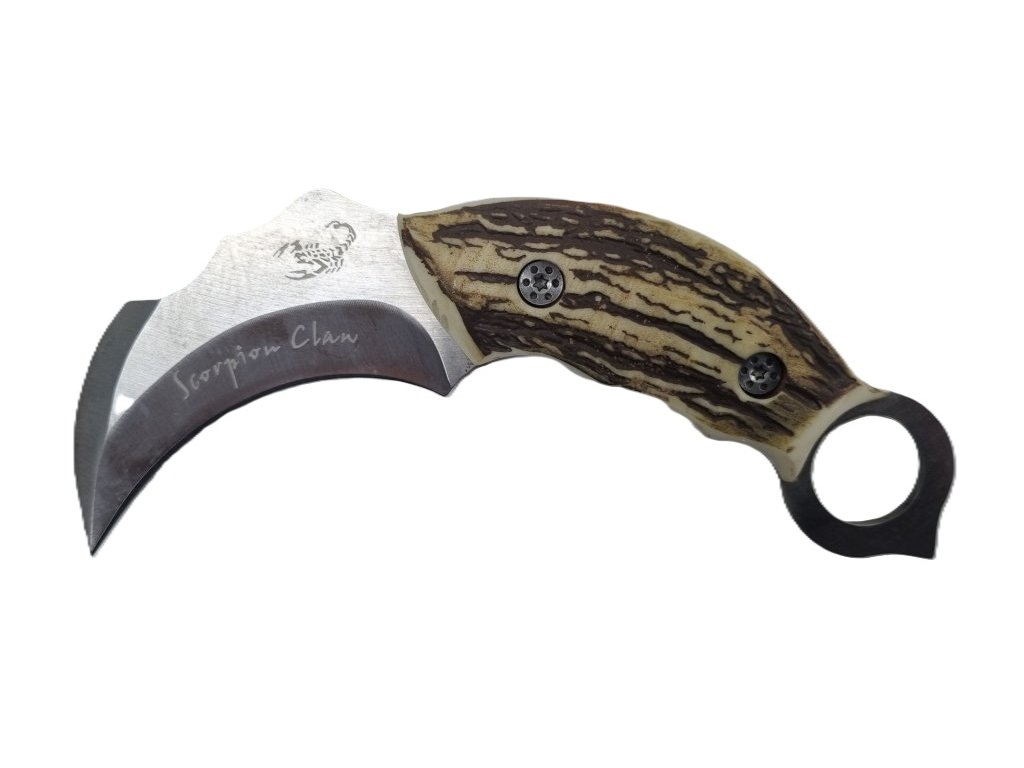 Bojový obranný nôž karambit so zahnutou nerezovou čepeľou na ktorej je vygravírovaný škorpion. Má tvarovanú rukoväť z parožia zakončenú kovovým očkom a hnedé púzdro z umelej kože. Dĺžka noža 20/8cm. Dodáva sa v darčekovom balení.