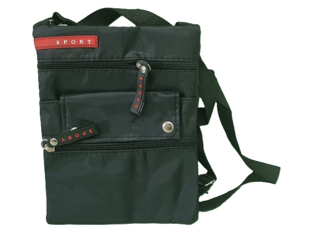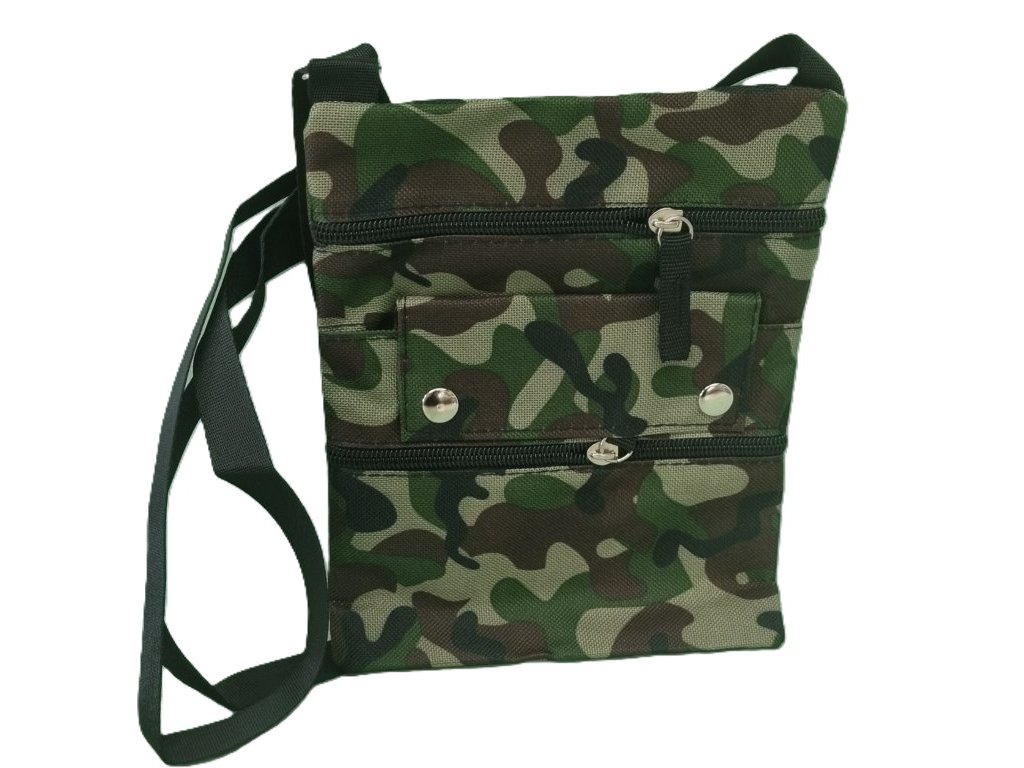 Praktická malá taška cez plece má jednu zadnú a dve predné priehradky uzatvárané na zips. Jedna predná priehradka sa uzatvára na patent. Popruh je nastaviteľný široký 2,5cm. Rozmer tašky je 20x17cm