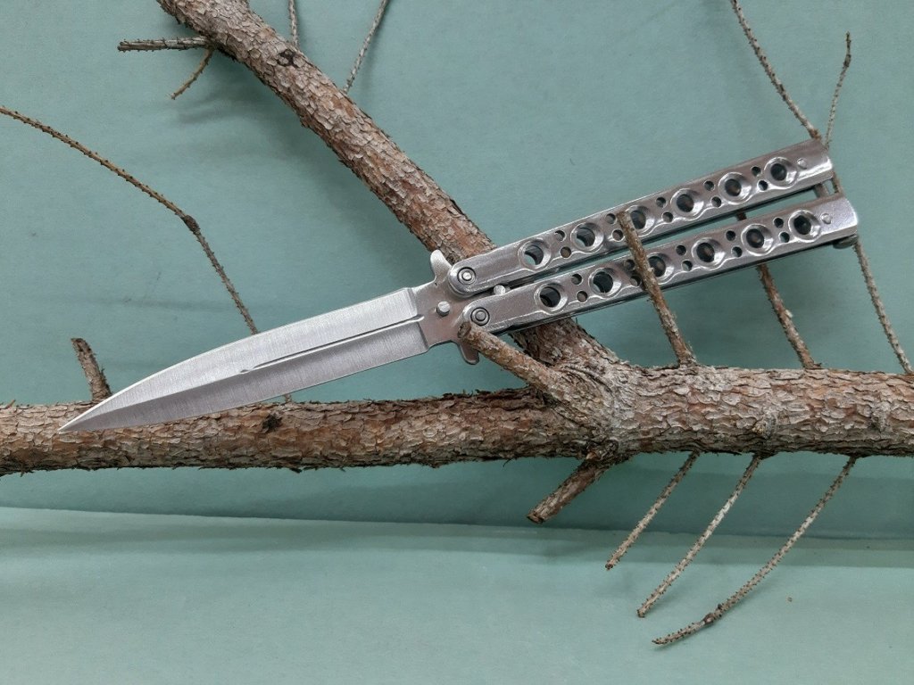 Nôž skladací, motýľ s nerezovou čepeľou, plnofarebný-strieborný. Na rukoväti je kolík pre zaistenie v otvorenom aj zatvorenom stave. Dĺžka noža 23/10cm.