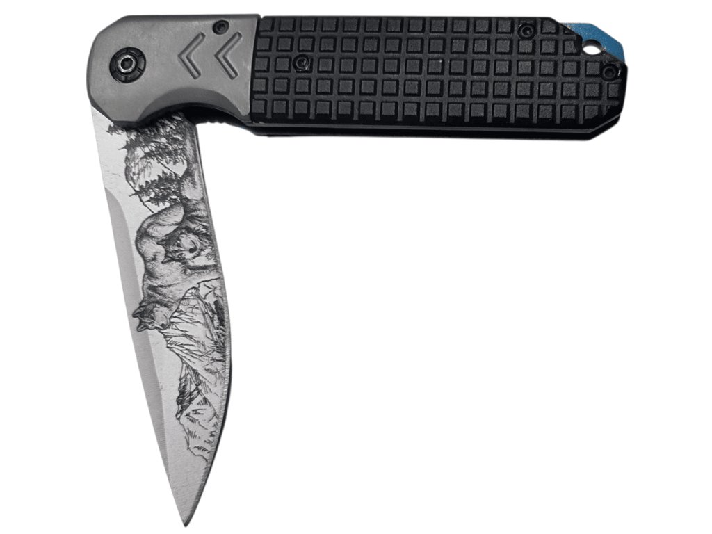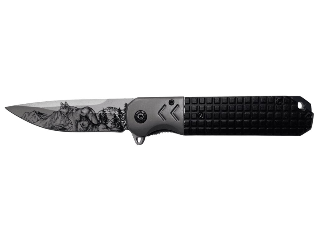 Moderný zatvárací nôž s originálnym dizajnom čepele s motívom vlkov a horskej krajiny. Čepeľ s dĺžkou 10 cm je vyrobená z kvalitnej ocele a má hladké ostrie vhodné na každodenné použitie.