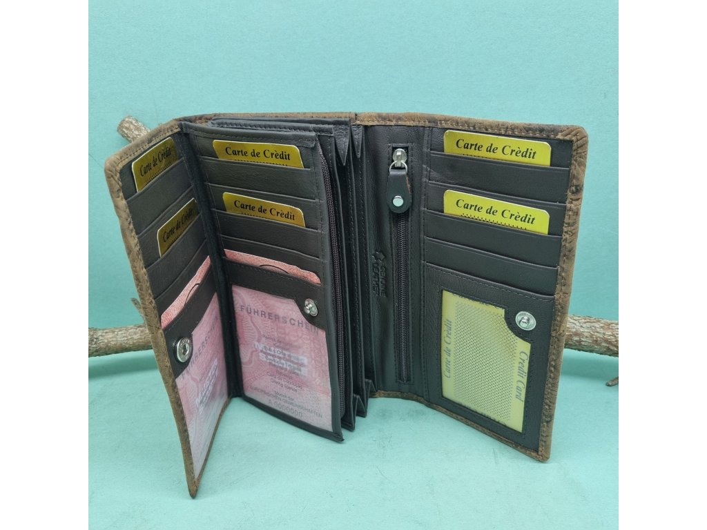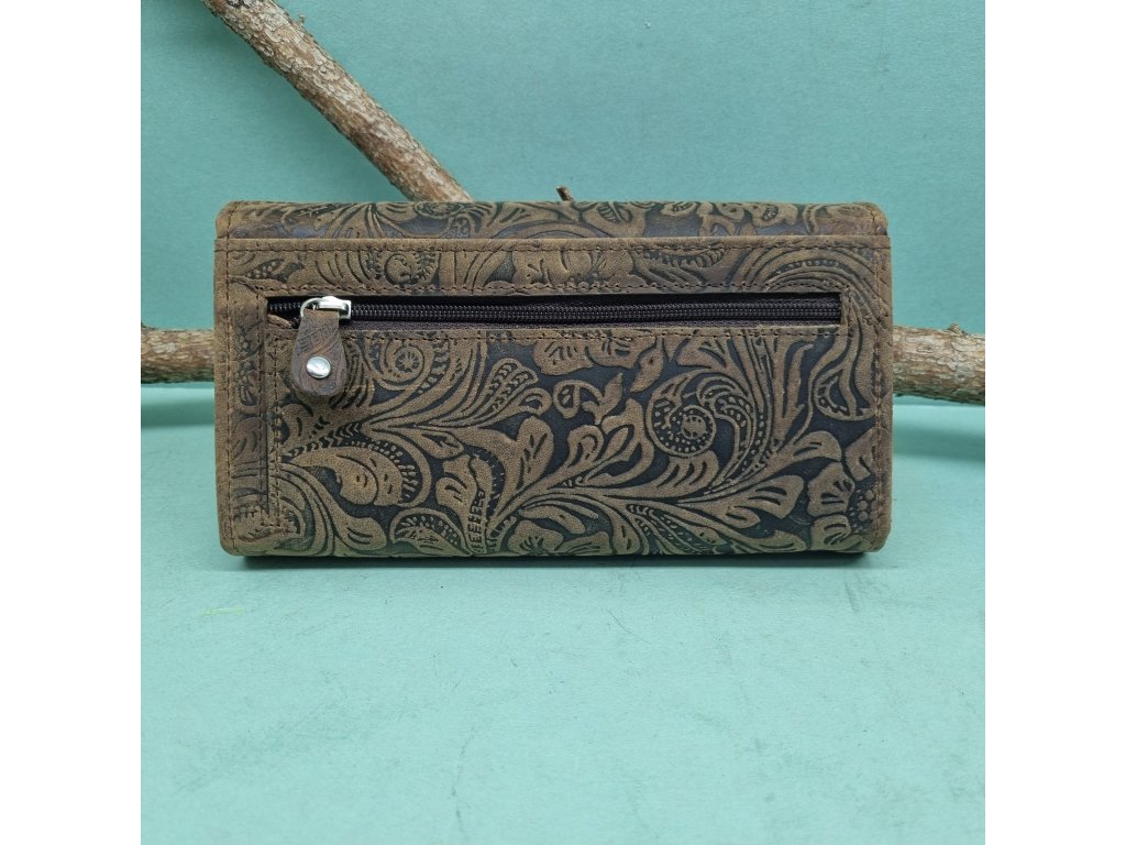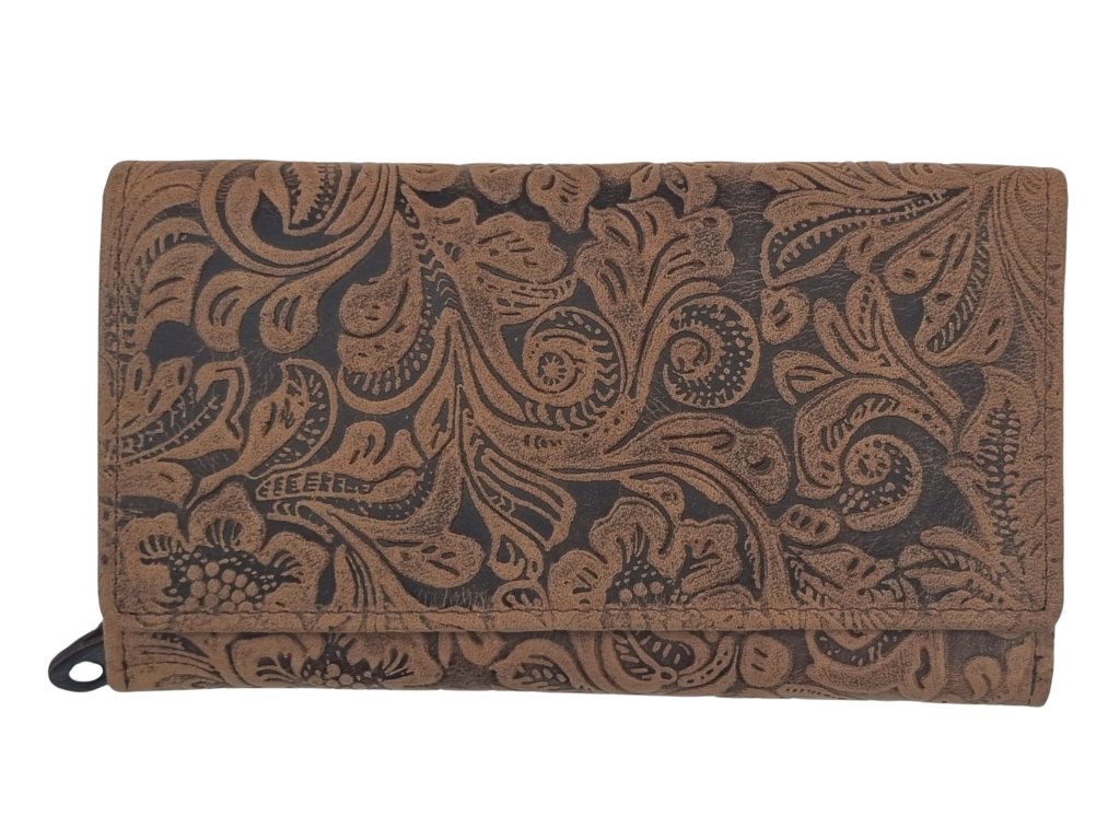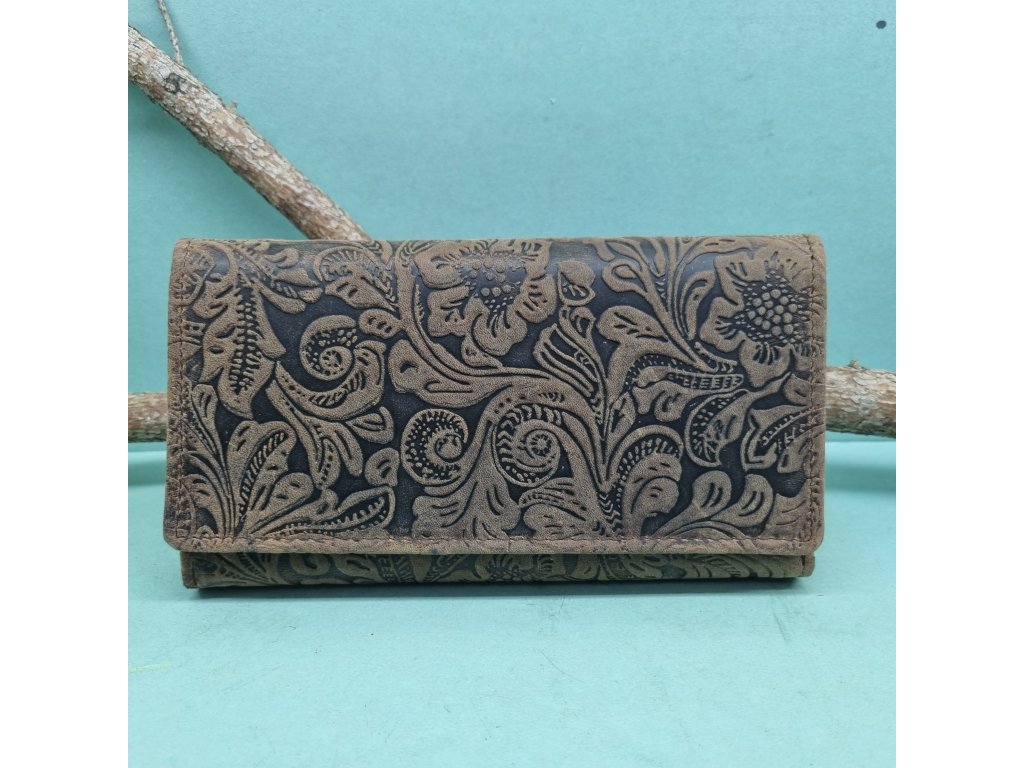 Dámska peňaženka z pravej kože s razeným kvetinovým vzorom po celom obvode. Peňaženka obsahuje 12 slotov na kreditné karty, 3 priehľadné priehradky na fotky, 4 vnútorné univerzálne priehradky, 1 veľký delený mincovník na zips, 2 zipsové priehradky, 1 otvorený priečinok na zadnej strane a 2 priehradky na bankovky. Rozmery peňaženky 18x10x3,5cm.