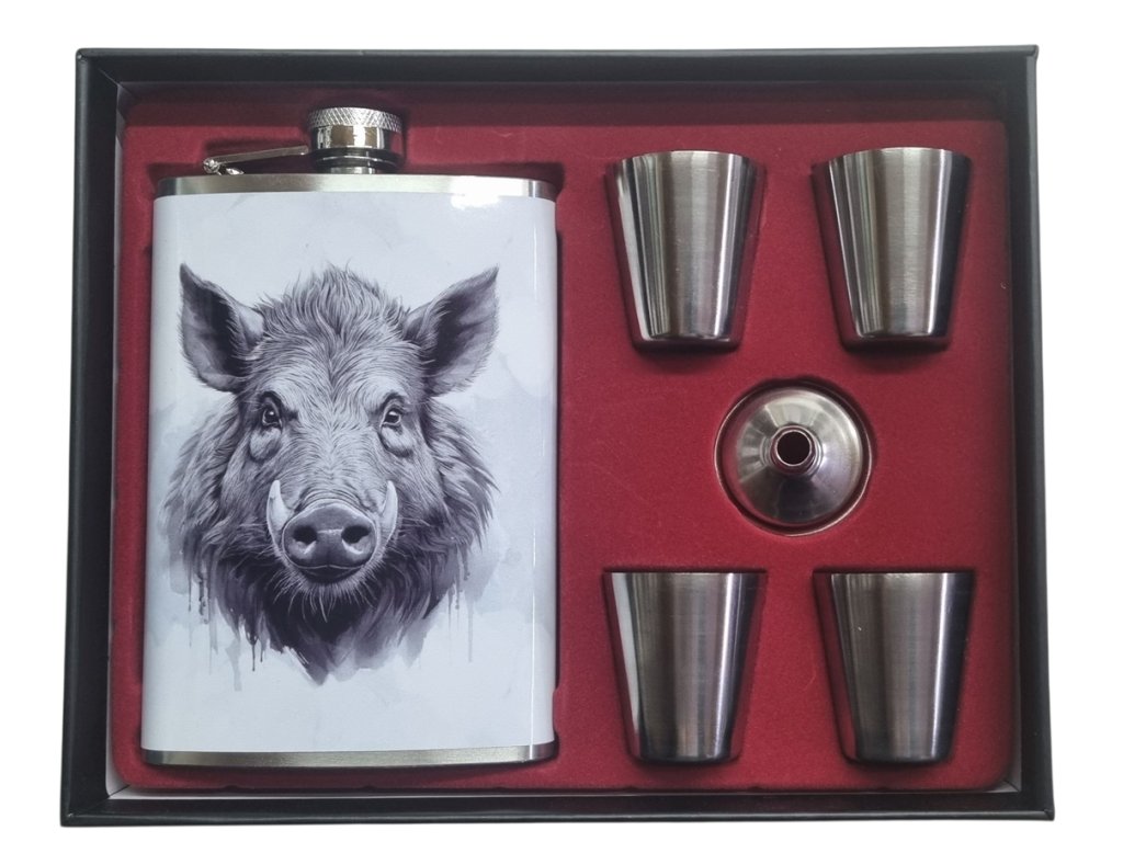 Darčeková sada ploskačka Diviak čb + 4 poháriky a lievik pre jednoduchšie nalievanie destilátu. Objem ploskačky si môžete zvoliť 240 ml, 270 ml. Objem pohárika - 35 ml. Komplet je balený v krásnom darčekovom balení. Nerezová ploskačka je potlačená motívom Diviak čb. Sada je vhodná ako dekorácia alebo praktický darček hlavne pre mužov, poľovníkov, rybárov, či turistov.