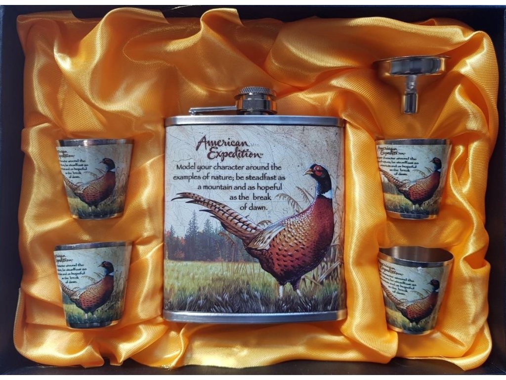 Darčeková sada ploskačka bažant + 4 poháriky a lievik pre jednoduchšie nalievanie destilátu. Objem ploskačky 180ml. Komplet je balený v krásnom darčekovom balení. Nerezová ploskačka je potlačená motívom Bažanta. Sada je vhodná ako dekorácia alebo praktický darček hlavne pre mužov, poľovníkov, rybárov, či turistov.