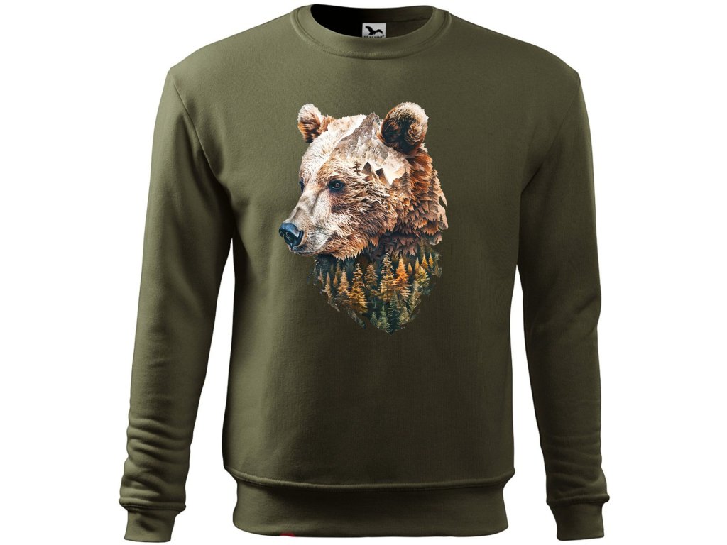 Štýlová, pohodlná a odolná mikina, ktorá poteší každého poľovníka, milovníka prírody či outdoorového nadšenca. V atraktívnej vojenskej (military) zelenej farbe s originálnym poľovníckym  motívom  Medveď, ktorý dotvára  jedinečný charakter tohto kúsku. Mikina má rovný strih s bočnými švami pre pohodlné nosenie, manžety, dolný lem a priekrčník sú z rebrového úpletu 1:1 s prídavkom elastanu, vďaka čomu výborne sedia a držia tvar. Vnútorná počesaná strana zabezpečuje hrejivosť a príjemný pocit pri nosení aj počas chladných dní.