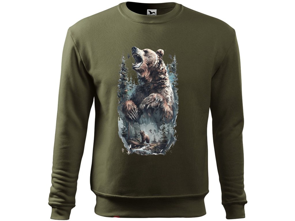 Štýlová, pohodlná a odolná mikina, ktorá poteší každého poľovníka, milovníka prírody či outdoorového nadšenca. V atraktívnej vojenskej (military) zelenej farbe s originálnym poľovníckym  motívom  Medveď, ktorý dotvára  jedinečný charakter tohto kúsku. Mikina má rovný strih s bočnými švami pre pohodlné nosenie, manžety, dolný lem a priekrčník sú z rebrového úpletu 1:1 s prídavkom elastanu, vďaka čomu výborne sedia a držia tvar. Vnútorná počesaná strana zabezpečuje hrejivosť a príjemný pocit pri nosení aj počas chladných dní.