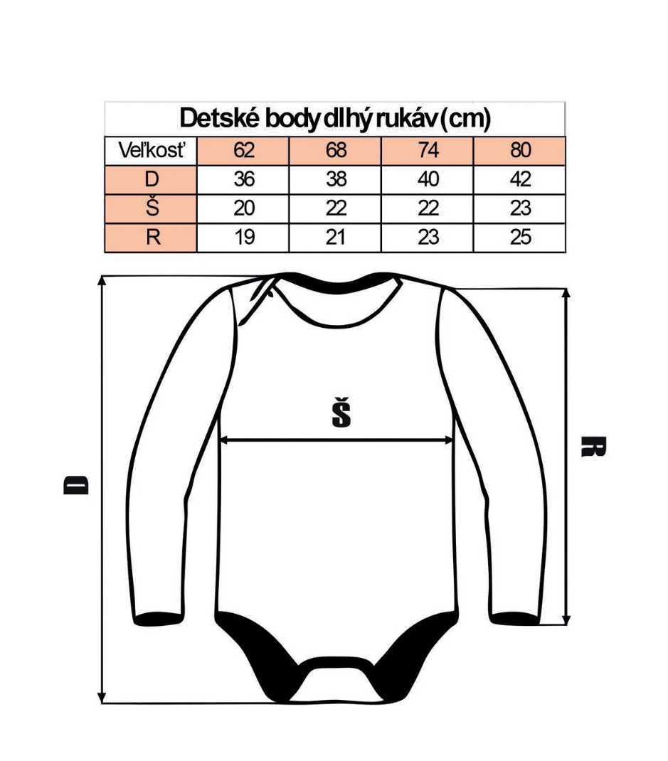 Originálne bavlnené dojčenské body s dlhým rukávom s potlačou, použité farby k potlači sú certifikované a zdravotne nezávadné. Je vyrobené z príjemného a kvalitného materiálu bavlna, v ktorom sa Vaše bábätko bude cítiť príjemne. Praktické zapínanie na cvočky na ramienku a medzi nožičkami uľahčí obliekanie a prebaľovanie. Body je pre bábätká dôležitým kúskom oblečenia, pri akomkoľvek pohybe je chrbátik bábätka stále chránený. Ošetrovanie : prať na 30°C obrátené naruby, nežehliť cez potlač, nevhodné do sušičky.