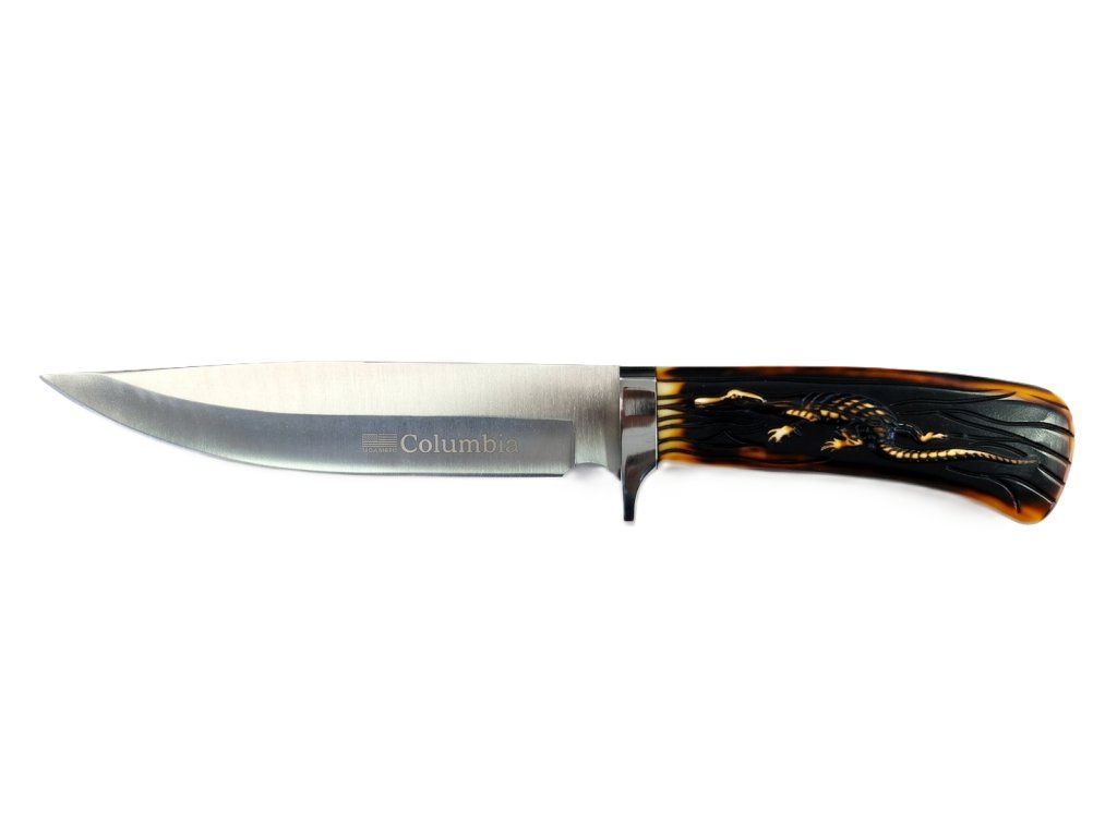 Columbia lovecký nôž spája robustnú funkčnosť s výrazným dizajnom, vďaka čomu je ideálnym pre poľovníkov, rybárov, zberateľov aj dokonale poslúži ako kuchynský nôž. Dominantným prvkom je detailne spracovaná rukoväť s motívom plaza, ktorý dodáva nožu unikátny charakter.