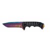Poľovnícky celokovový nôž s dúhovou čepeľou a plastovou rukoväťou. Na spodnej časti sa nachádza dierka na prevlečenie špagátu alebo lanka. Súčasťou je čierne nylónové púzdro s možnosťou upevnenia na opasok.