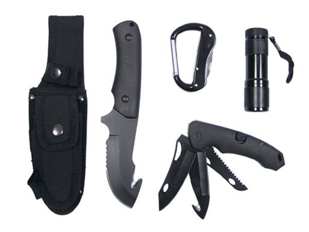 Praktická viacúčelová sada pozostáva z noža s pílkou, skladacieho multifunkčného noža, karabíny, baterky a puzdra.
