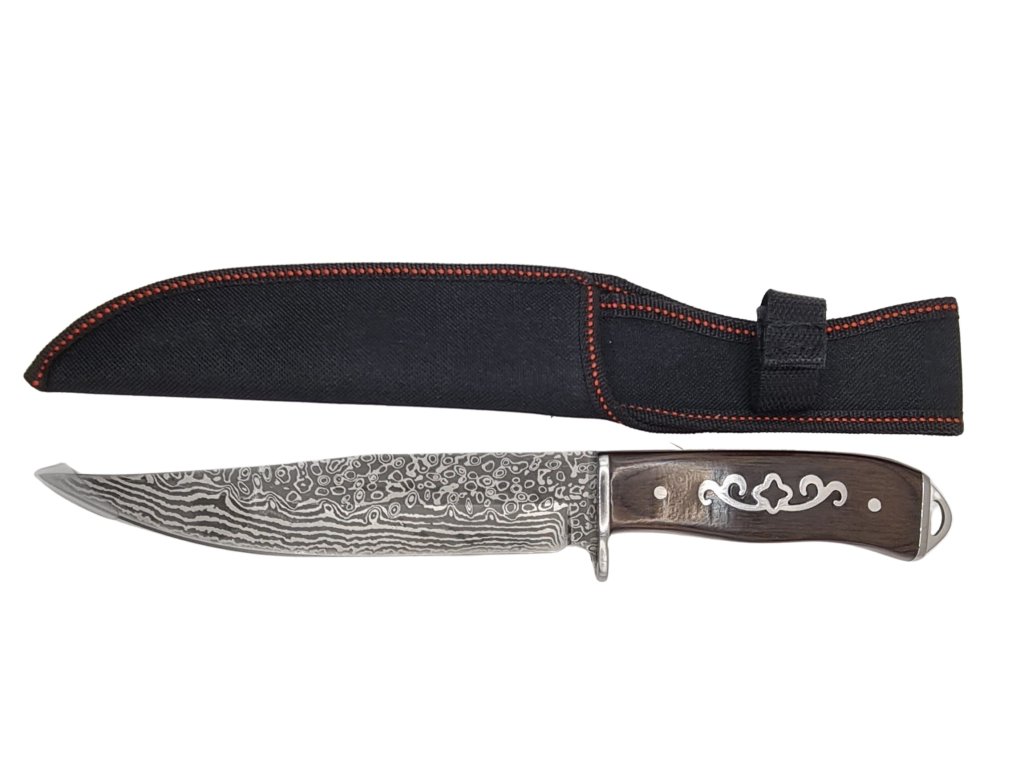 Veľmi efektný poľovnícky nôž s nerezovou čepeľou imitácia damašku a kombinovanou rukoväťou drevo-kov. Dodáva sa spolu s nylónovým puzdrom, ktorý sa dá upevniť na opasok.