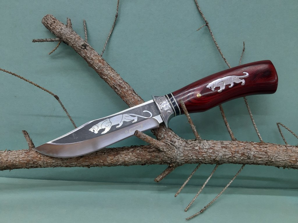Poľovnícky nôž s motívom puma na čepeli a na drevenej tvarovanej rukoväti. Súčasťou je čierne nylónové puzdro s možnosťou upevnenia na opasok.