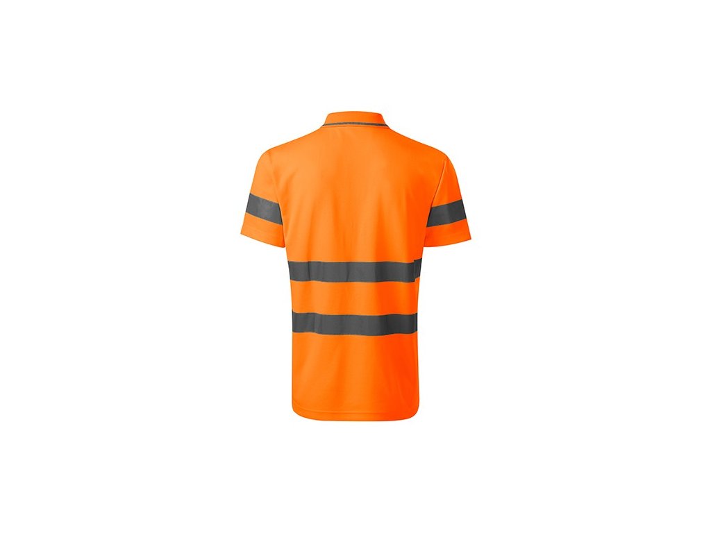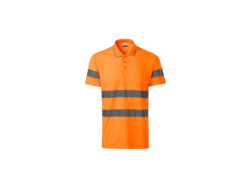 Unisex polokošela v oranžovom prevedení s bočnými švami. Limček s kontrasným prúžkom z rebrového úpletu 1:1, vpredu sú 3 gombíky na zapínanie, ramenné švy sú spevnené páskou, použité sú certifikované retroreflexné pruhy výrobcu 3M, odev je certifikovaný podľa normy EN ISO 20 471:2013 , EN ISO 13 688:2013. Veľkosť: S-3XL. Prateľné na: 40 °C. Vyrobené z 55% bavlny a 45% polyesteru.