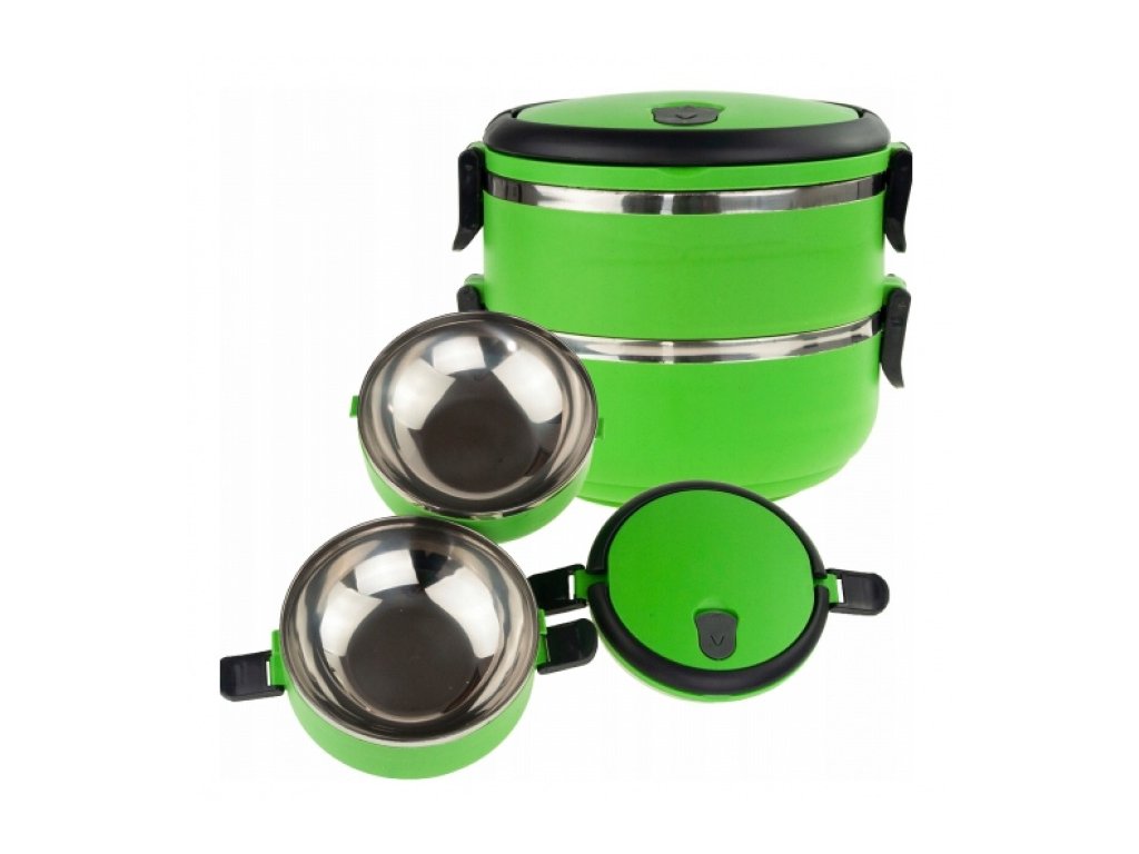 Dvojdielny obedár je šikovnou pomôckou na hygienické a bezpečné prenášanie potravín. Pohodlne v ňom viete prepraviť polievku, hlavné jedlo, dezert, nejaký šalát alebo raňajkovú zmes ako kaše či samotné ovocie. Nádoby sú vyrobené z odolnej nerezovej ocele a majú plastový kryt z PP, ktorý chráni potraviny a zaisťuje ľahké čistenieObjem obedára je 1,4L