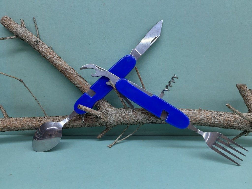 Rozkladací príbor v modrom prevedení obsahuje lyžicu, vidličku, veľký a malý nôž, otvárač na konzervy a vývrtku.