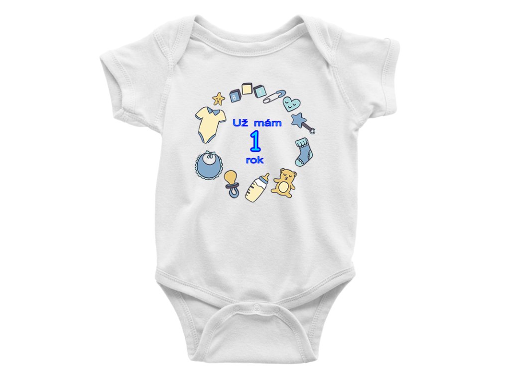 Originálne bavlnené dojčenské body s krátkym rukávom s nápisom Už mám jeden rok, použité farby k potlači sú certifikované a zdravotne nezávadné. Je vyrobené z príjemného a kvalitného materiálu 100% bavlna, v ktorom sa Vaše bábätko bude cítiť príjemne. Praktické zapínanie na cvočky na ramienku a medzi nožičkami uľahčí obliekanie a prebaľovanie. Body je pre bábätká dôležitým kúskom oblečenia, pri akomkoľvek pohybe je chrbátik bábätka stále chránený. Ošetrovanie : prať na 30°C obrátené naruby, nežehliť cez potlač, nevhodné do sušičky.
