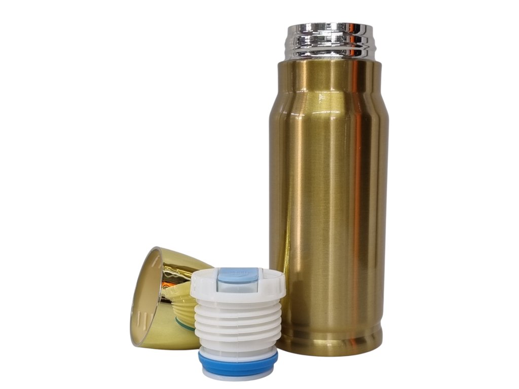 Nerezová termoska v tvare náboja s objemom 330ml. Vrchnák slúži ako pohár, poistný uzáver ako dávkovač.