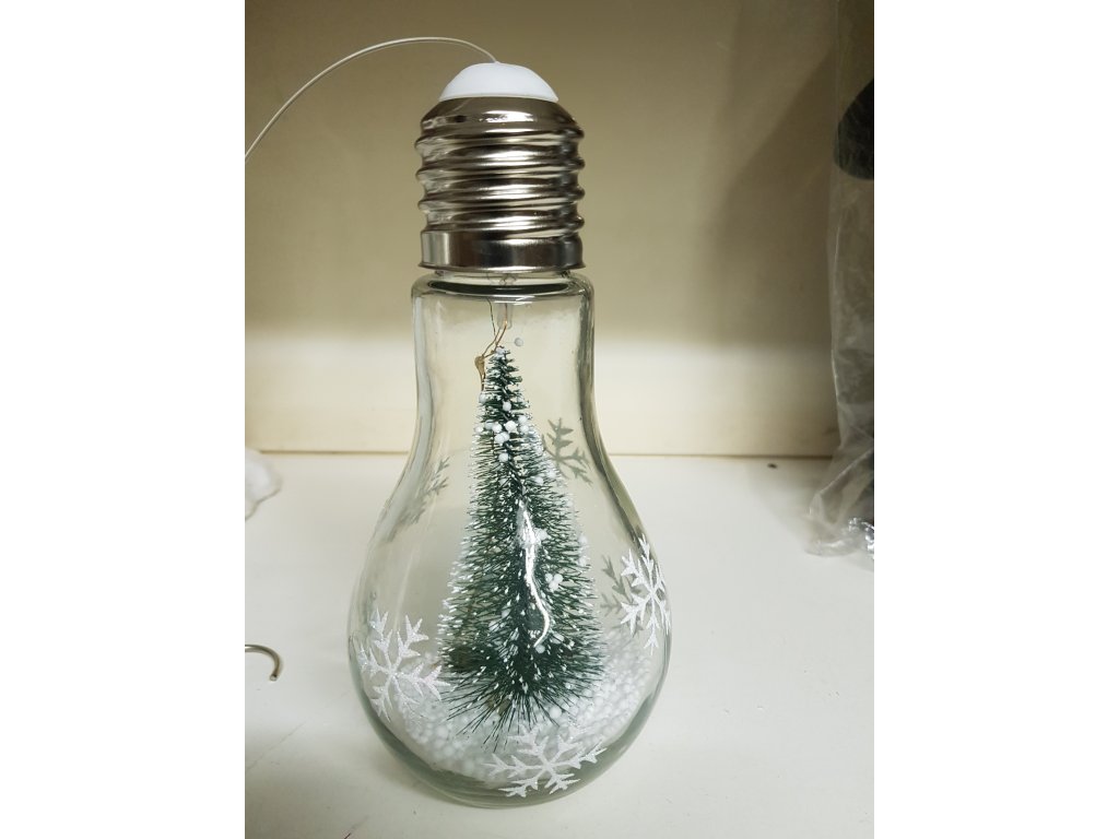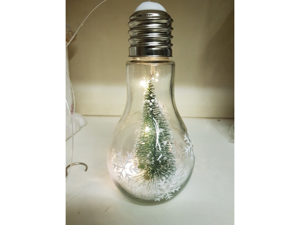 Vianočná dekorácia žiarovky so svietiacim stromčekom. Batéria súčasť balenia. Vo vnútri žiarovky umelý sneh a zelený stromček so so svetielkami. Dekorácia visí na hrubšom silóne na konci ktorého je háčik na zavesenie. Výška 18cm
