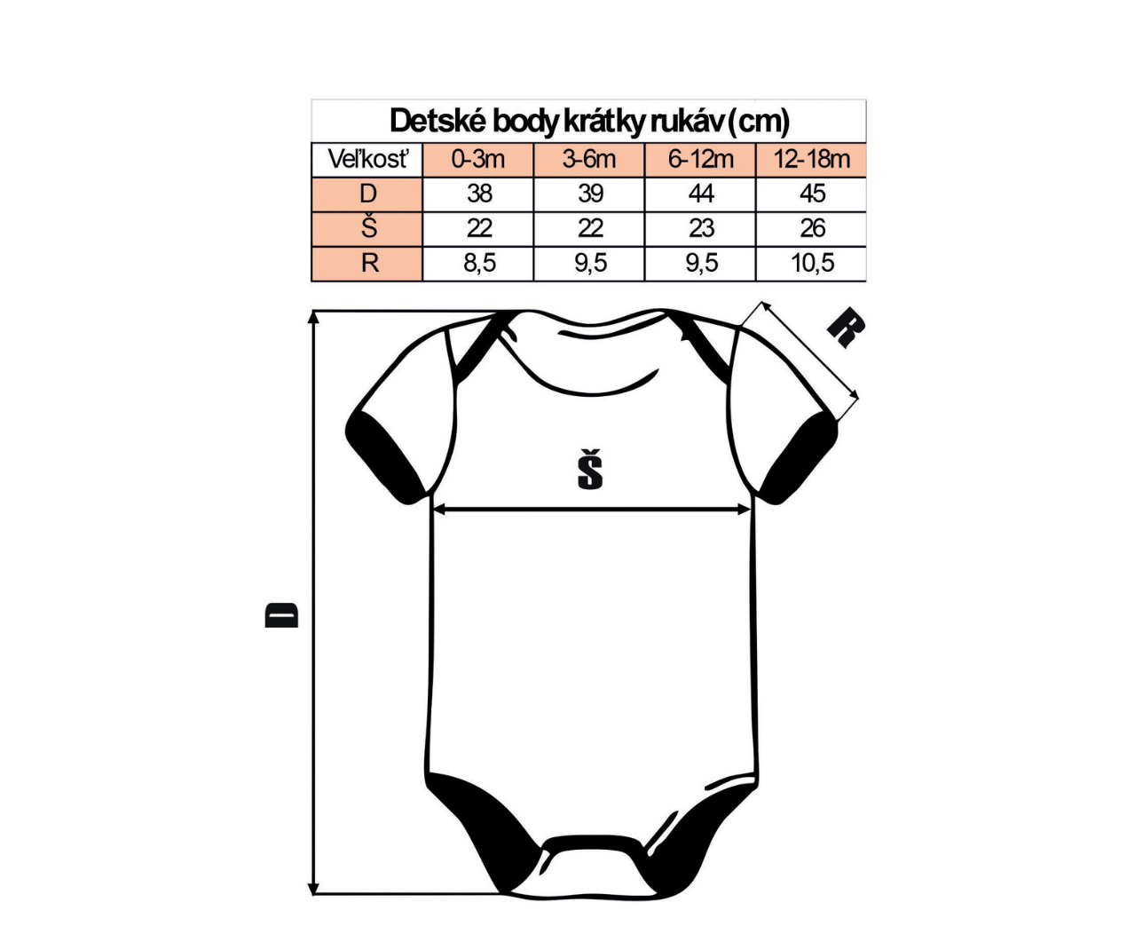 Originálne bavlnené dojčenské body s krátkym rukávom s potlačou, použité farby k potlači sú certifikované a zdravotne nezávadné. Je vyrobené z príjemného a kvalitného materiálu 100% bavlna, v ktorom sa Vaše bábätko bude cítiť príjemne. Praktické zapínanie na cvočky na ramienku a medzi nožičkami uľahčí obliekanie a prebaľovanie. Body je pre bábätká dôležitým kúskom oblečenia, pri akomkoľvek pohybe je chrbátik bábätka stále chránený. Ošetrovanie : prať na 30°C obrátené naruby, nežehliť cez potlač, nevhodné do sušičky.