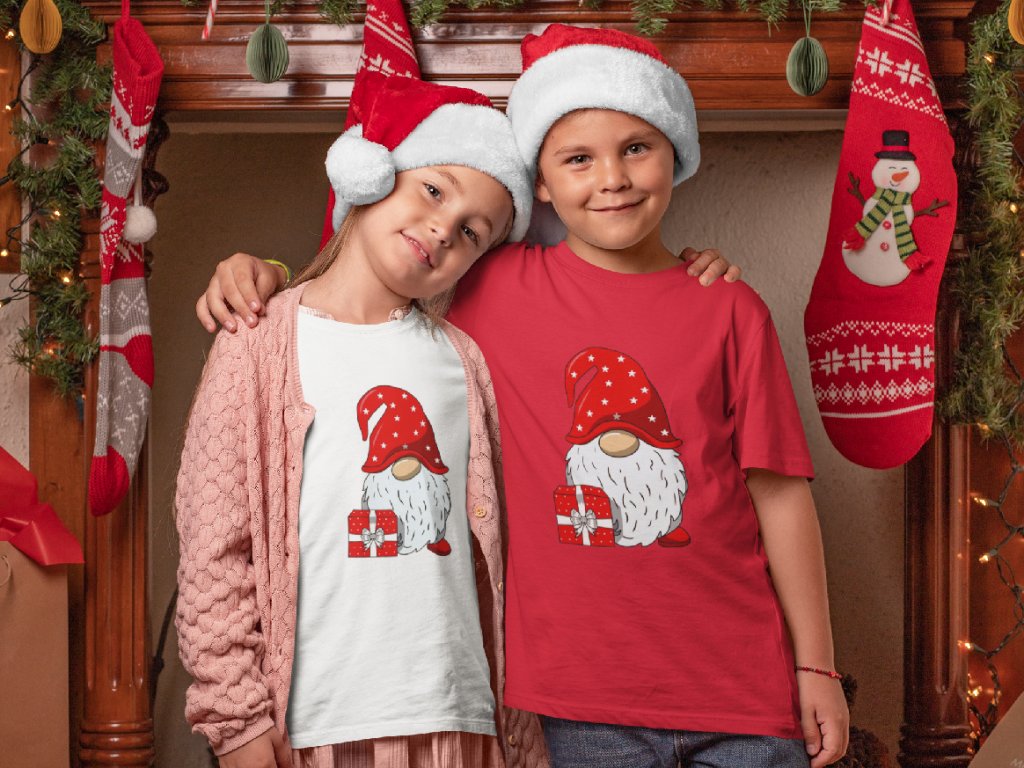 Tričko s vianočným motívom škriatok. S hmotnosťou 160g a zložením z 100% bavlny je toto tričko ľahké, priedušné a pohodlné na nosenie, čo je dôležité pre aktívne deti.