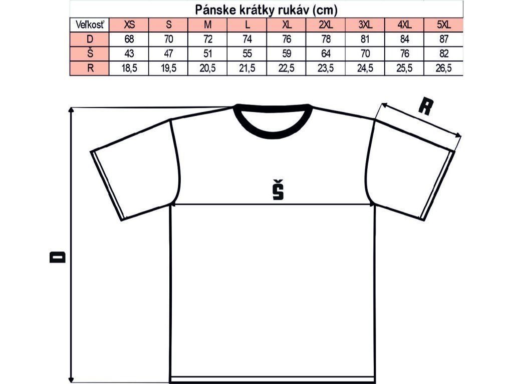 Tričko s krátkym rukávom je dostupné v bežných pánskych veľkostiach. Vyhotovené v klasickom pohodlnom pánskom strihu bez bočných švov. Okrúhly výstrih pevný lem okolo krku, ktorý sa časom nevytiahne. Švy sú kvalitne spracované a rukávy aj spodný lem sú spevnené dvojitým prešitím. Bolo navrhnuté tak, aby dobre sedelo na postave, neobmedzovalo v pohybe a zároveň si dlhodobo držalo tvar.
