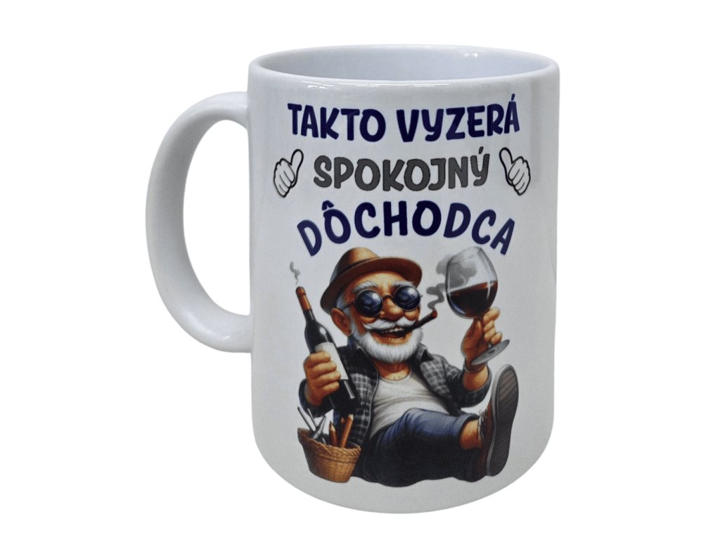 Vtipný hrnček s originálnou potlačou „Takto vyzerá spokojný dôchodca“ je ideálnym darčekom pre každého, kto si užíva zaslúžený oddych. Veselý motív usmiateho pána s pohárom vína dokonale vystihuje pohodu a radosť z dôchodku.