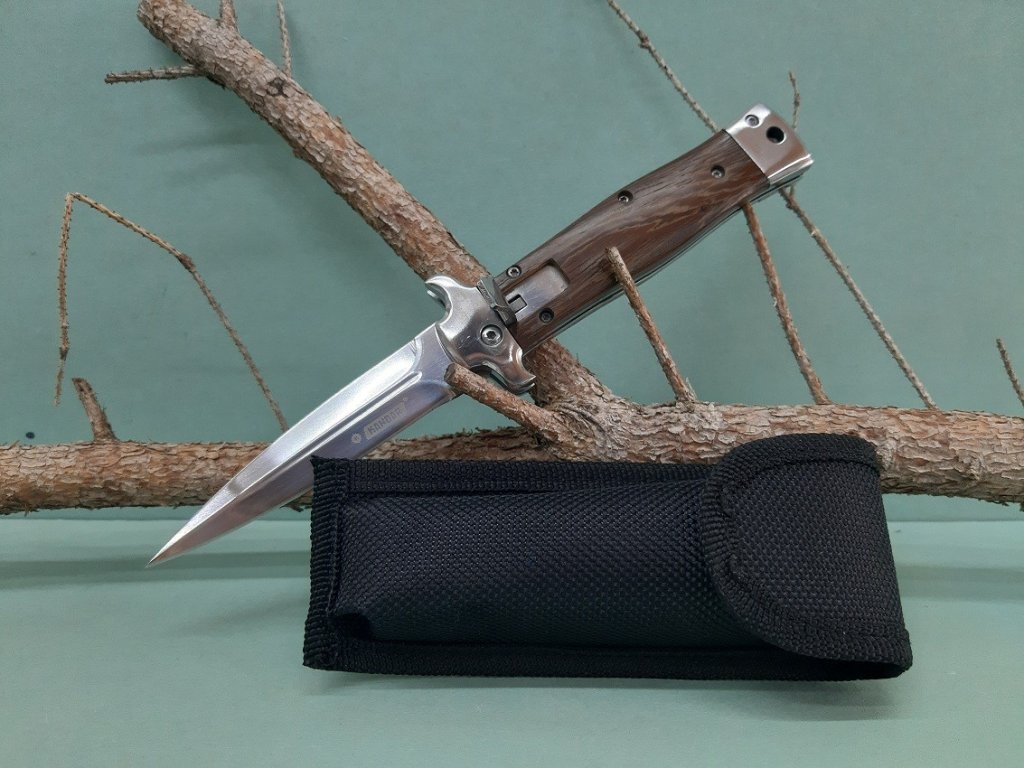 Vreckový nôž K546, nerezová vyskakovačka s čiernym nylónovým puzdrom a drevenou rukoväťou. Dĺžka čepele je 10 cm a celková dĺžka noža je 22 cm. Na zadnej strane sa nachádza klip na uchytenie napr. na opasok.