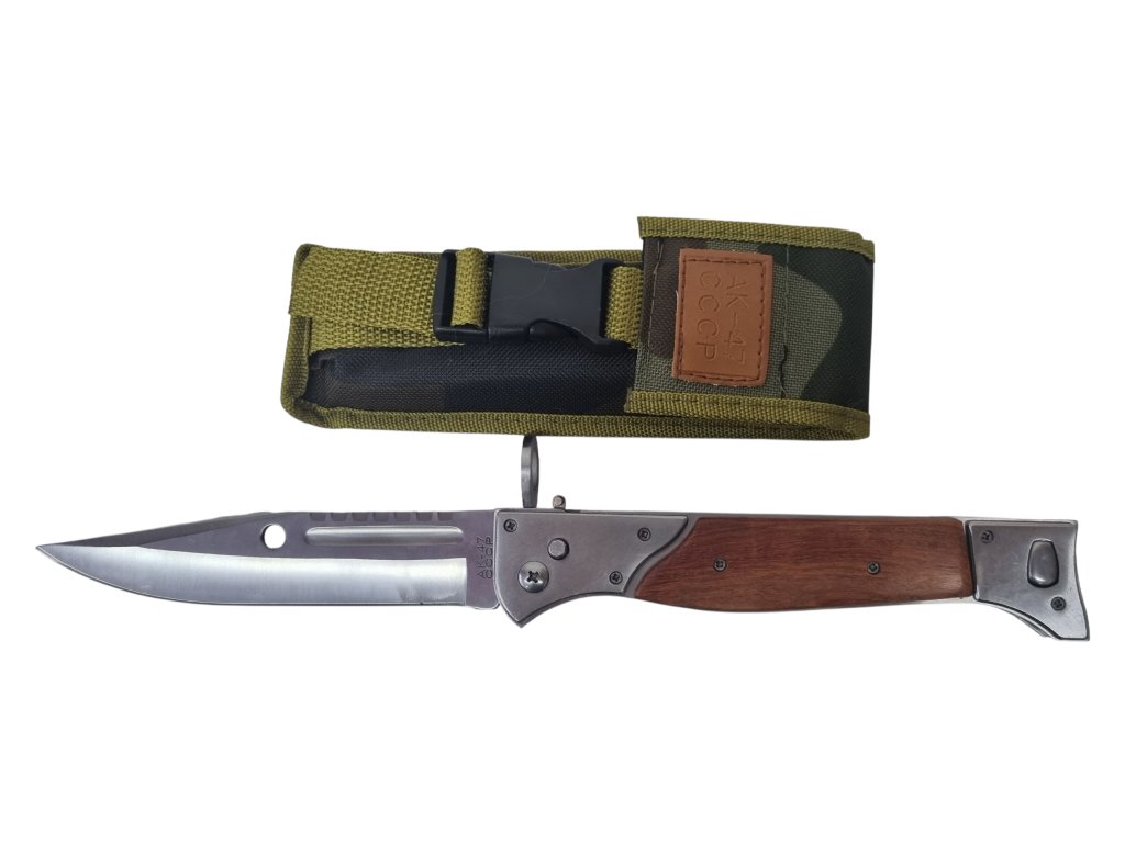 Vreckový vyskakovací nôž s nerezovou čepeľou a kombinovanou rukoväťou drevo/kov. Tlačidlo na otvorenie noža jednou rukou s poistkou. Súčasťou balenia púzdro. Dĺžka noža je 27 a dĺžka čepele 12cm.